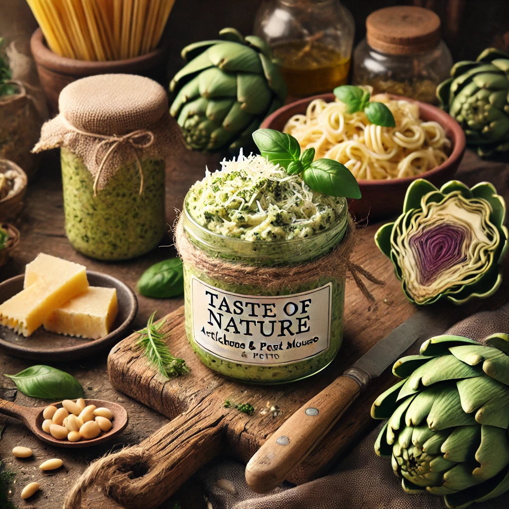 Fluffy grilled artichoke pasta with pesto. Artichoke 65%, olive oil, fresh basil 20%, spices, stabilizers of vegetable origin (xanthan).